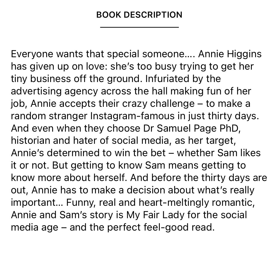 tentando fazer seu pequeno negócio decolar. Enfurecida pelo deboche da agência de propaganda do outro lado do corredor, Annie aceita um desafio maluco: tornar um estranho aleatório famoso no Instagram em apenas trinta dias. Mesmo quando escolhem como alvo o Dr. Samuel Page, historiador PhD que detesta mídias sociais, Annie está determinada a ganhar a aposta, independentemente se Sam vai gostar ou não. Mas conhecer Sam significa conhecer mais a si mesma. E antes que os trinta dias acabem, Annie tem que tomar uma decisão sobre o que é realmente importante… Engraçado e real, um romance que derrete o coração, a história de Annie e Sam é a versão do filme My Fair Lady, de Audrey Hepburn, da era das mídias sociais. Uma leitura gostosa.